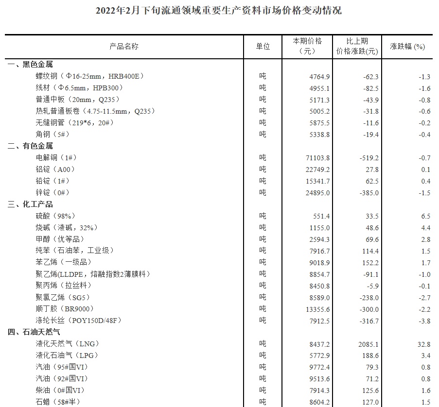 智通财经APP获悉,3月4日,国家统计局发布2022年2月下旬流通领域重要生产资料市场价格变动情况。据对全国流通领域9大类50种重要生产资料市场价格的监测显示,2022年2月下旬与2月中旬相比,27种产品价格上涨,23种下降。其中,液化天然气(LNG)价格环比上涨32.8%,硫酸(98%)价格上涨6.5%,豆粕(粗蛋白含量≥43%)价格上涨9.3%,生猪(外三元)价格上涨1.6%。