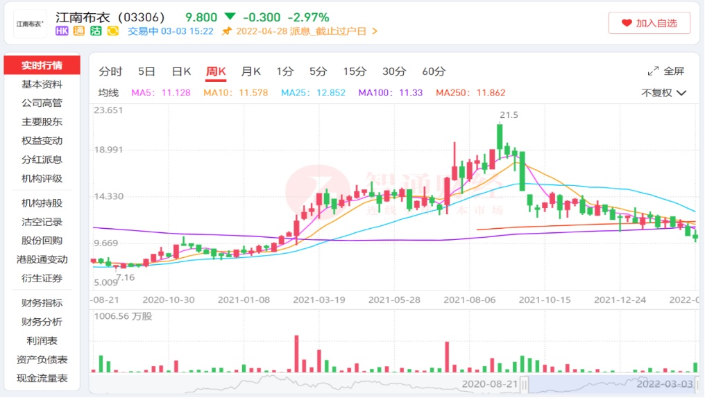 2021年9月,江南布衣(03306)发生童装“不当图案”事件,至此,公司在二级市场的“白马”形象大打折扣,股价自2021年8月高点跌幅超过5成。与此同时,上述事件给江南布衣业绩带来的连锁反应也正在显现。