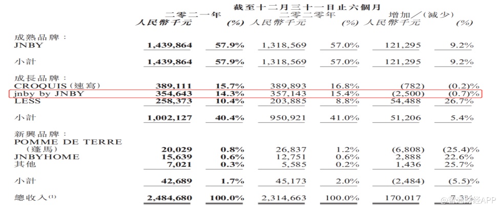 经过“不当图案”事件的冲击后,jnby by JNBY2022财年中期营收下滑0.7%至3.55亿元,占营收比重由上年同期的15.4%下降1.1个百分点至14.3%。