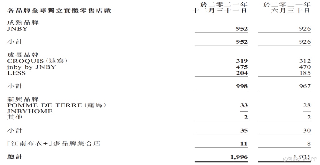 jnby by JNBY销售表现欠佳,江南布衣也放缓了品牌开店速度。截至期末jnby by JNBY的门店数量为475家,环比增长5家,为成熟品牌和成长品牌中开店数量最少的品牌。