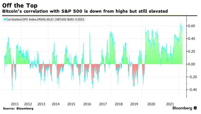另外,虽然有分析师人认为比特币是一种避险投资,但在过去几年里,比特币的走势与美股等风险资产更为一致。下图也可以看到,尽管目前比特币与标普500指数之间的相关性已从大约一个月前的最高水平回落,但相对于历史水平而言仍处于高位。