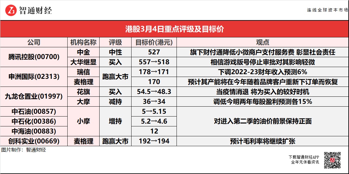 大华继显维持腾讯控股(00700)“买入”评级,目标价由557港元降7%至518港元。该行预计,腾讯去年第4季总收入同比升12%;非通用会计准则纯利同比跌7%;2021全年数字则分别预计升17%/6%。2022年总收入及纯利预计同比升13%/11%。不过,去年第4季线上广告收入预计同比跌4%。由于广告监管收紧及去年上半年高基数效应,预计2022年上半年广告收入增长放缓。管理层称,将逐步在其短影片(SFV)平台寻求变现机会。但用户付费观看SFV意愿仍未成熟,认为短期腾讯变现模式只涉及版权内容,如NBA直播。此外,该行预测,腾讯2021年第4季游戏收入同比升9%,相信游戏版号停止审批对公司影响轻微。公司手上仍有16款已获批游戏,预计每季推4-5款,以及预期短期线上游戏板块受惠于海外强劲增长,并对现有国内游戏表现有信心。