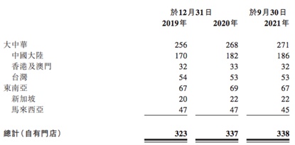 截至2021年9月30日止,公司在全球22个市场逾90个城市设有自有门店及特许经营店,共拥有338家自有门店及115家特许经营店。