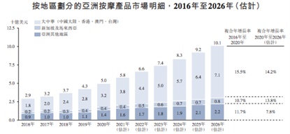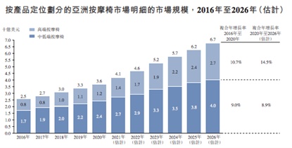 于2016年至2020年,按摩椅产品为亚洲按摩产品市场销售贡献均超72%。根据灼识咨询,亚洲按摩椅市场以复合年增长率9.5%由2016年的25亿美元增加至2020年的36亿美元,并预期于2026年达至67亿美元,自2020年至2026年的预测复合年增长率为10.9%。