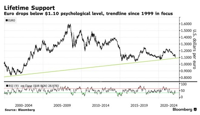 瑞穗金融机构外汇销售主管Neil Jones表示:“我现在的感觉是,欧元趋势应该继续走低。”他还补充道,如果欧元兑美元周五收于1.10下方,“可能会敲响欧元进一步下跌的警钟”。