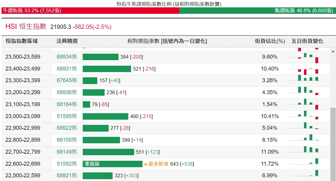 法兴恒指牛熊证街货分布图中的数据显示,熊证街货重货区与最多新增均在22,600-22,699区间,该区间最新熊证数量为643张,较上一交易日增加538张。