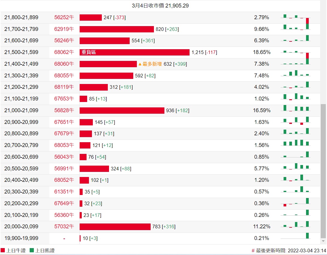 牛证街货重货区在21,500-21,599区间,该区间最新牛证数量为1,215张,较上一交易日减少117张;最多新增在21,400-21,499区间,该区间最新熊证数量为632张,较上一交易日增加399张。