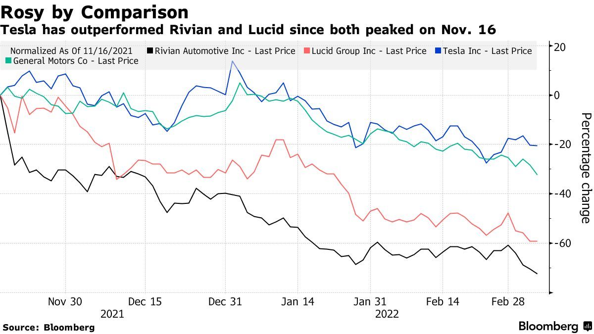 但油价并不代表一切。由于俄乌冲突升级扰乱了全球供应链,以及美联储即将开启加息周期,投资者对风险性保持警惕,尤其是那些还未盈利的公司。因此,电动汽车行业的可选择投资标的并不多。