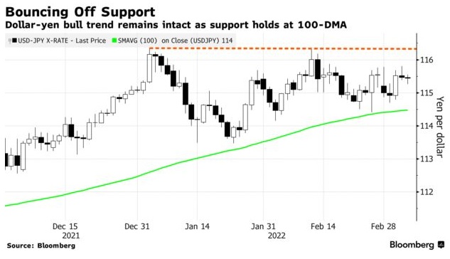 三菱UFJ摩根士丹利驻东京首席外汇策略师Daisaku Ueno表示:“乌克兰局势带来的最大副作用是大宗商品价格上涨,这扩大了日本的贸易逆差,从而恶化了日本的贸易条件。”“除此之外,美国本月料将升息,这将扩大利差,并导致美元买盘,因为预计日本央行不会在这种情况下改变政策。”