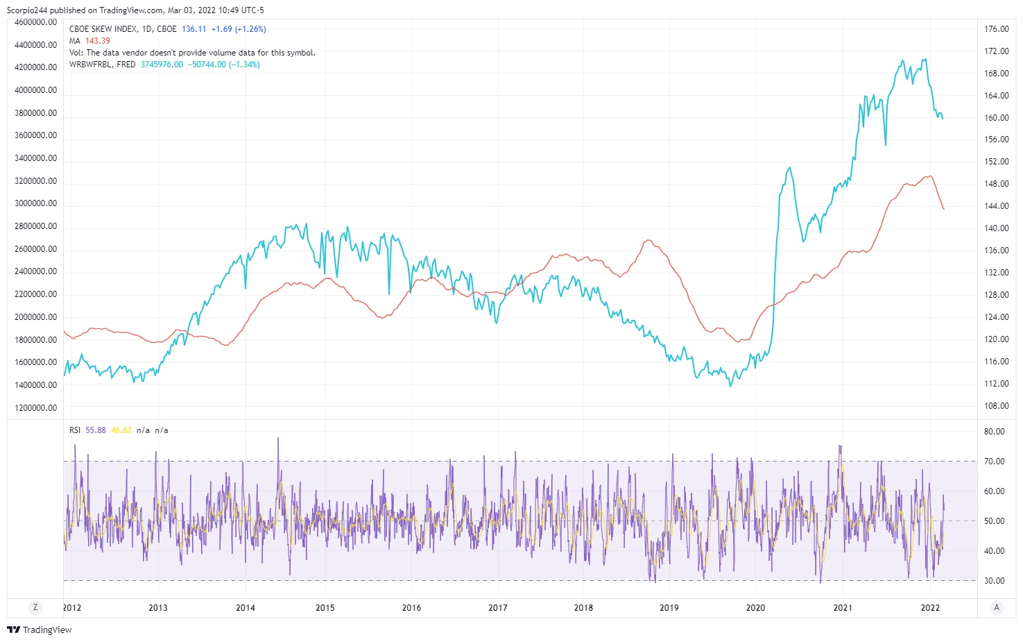准备金图表以及SKEW指数150日移动均线显示一个有趣的关系,表明随着美联储停止量化宽松政策,对冲空头波动率的需求正在减弱,因为出于对更高波动率的担忧,交易员不再从事这类空头波动率交易。