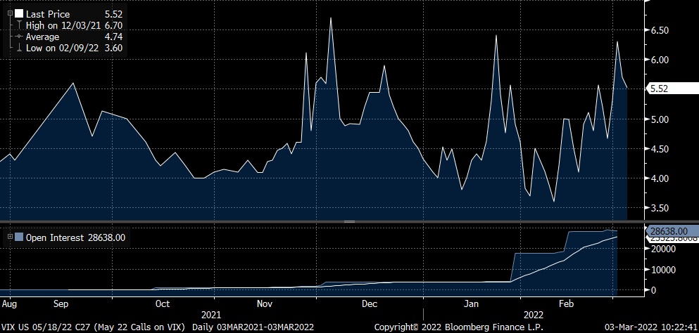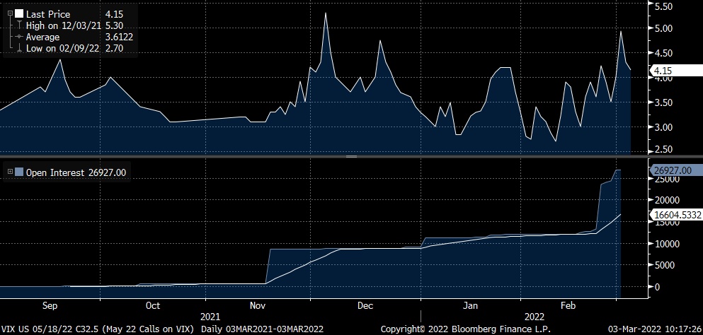 3月2日活跃的期权相当多,对VIX指数来说非常乐观。例如,3月3日,5月18日32.5看涨期权的未平仓合约增加了约15,100份,未平仓合约数量的变化反映了前一个交易日的期权活动。数据显示,这些看涨期权在ASK上交易,每份合约的买入价格为4.30美元。这意味着到5月中旬,VIX指数将徘徊在36.8点位上方的交易区间。这是一场规模可观的赌注,支付的保费金额超过600万美元。
