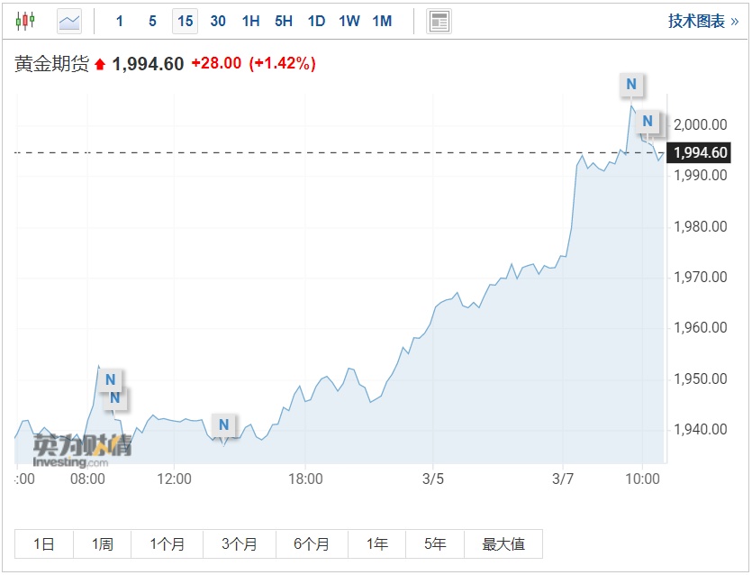 智通财经APP获悉,由于投资者在权衡俄乌冲突对地缘政治和经济的影响,市场对避险资产的需求不断增长,金价一度飙升至每盎司2000美元上方。截至发稿,4月黄金期货价格上涨1.42%,报每盎司1994.60美元。
