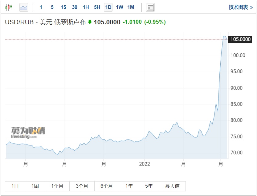 智通财经APP获悉,3月6日,美国国务卿布林肯表示,美国总统拜登和政府各部门正讨论是否对俄罗斯实施石油禁运,以对俄罗斯实施进一步制裁。由于投资者担心石油禁运将摧毁俄罗斯经济,俄罗斯卢布汇率在离岸交易中一度下跌10%,创历史新低。截至发稿,卢布汇率跌至1美元兑105卢布。