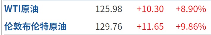 周一,由于美国白宫此前表示正在讨论对俄罗斯实施石油禁运,国际油价开盘飙升。截至发稿,WTI原油期货价格涨8.90%,报125.98美元/桶;布伦特原油期货价格涨9.86%,报129.76美元/桶。