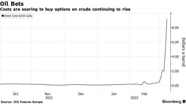 此外,布伦特原油期货6月合约行权价为150美元/桶的看涨期权价格较上周五涨100%,行权价为180美元/桶的看涨期权价格上涨110%。