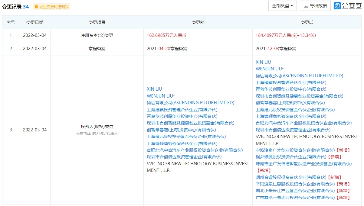智通财经APP获悉,企查查APP显示,近日,慷智集成电路(上海)有限公司发生工商变更,新增湖北小米长江产业基金合伙企业(有限合伙)等多名股东,同时公司注册资本由162.7万元增加至184.41万元,增幅13.34%。