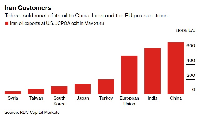 在受到制裁前,伊朗将大部分石油卖给了中国、印度和欧盟