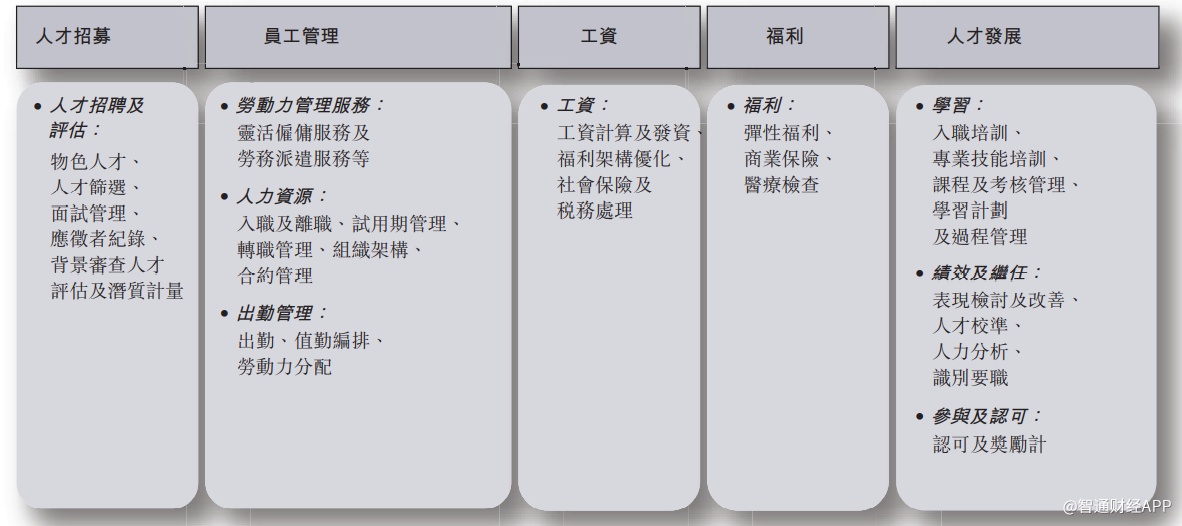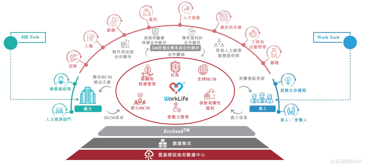 而CDP集团便是受益于HCM SaaS+市场快速成长的企业之一。智通财经APP了解到,成立于2004年的CDP集团,其于早期便开始专注于HCM流程软件的研发,在云服务兴起后,该公司抓住行业趋势推出基于云的、以用户为重心的CDP云平台,并对专有的HCM系统进行整合。至2018年时,为将平台数据打通,提升系统运营效率,CDP集团推出了EcoSaaS技术层,全面集成了基于云的HCM增值服务,并推出了应用程序WorkLife,整合公司的产品和服务,实现对全系列人力资本管理服务的一站式提供。