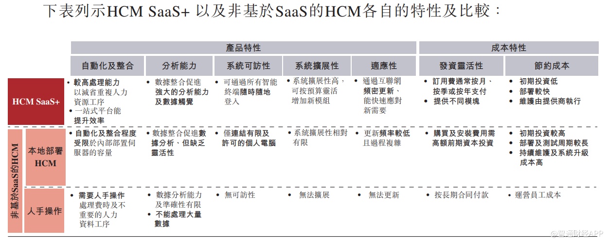 HCM行业的持续成长,离不开HCM SaaS+市场近年来的快速崛起。由于HCM SaaS+在自动化整合能力、分析能力、登入便捷性、系统扩展性及适应性、支付灵活度、安装及维护成本等方面与非HCM SaaS+技术相比有着独特优势,因此HCM SaaS+成为了推动HCM行业增长的关键动力之一。