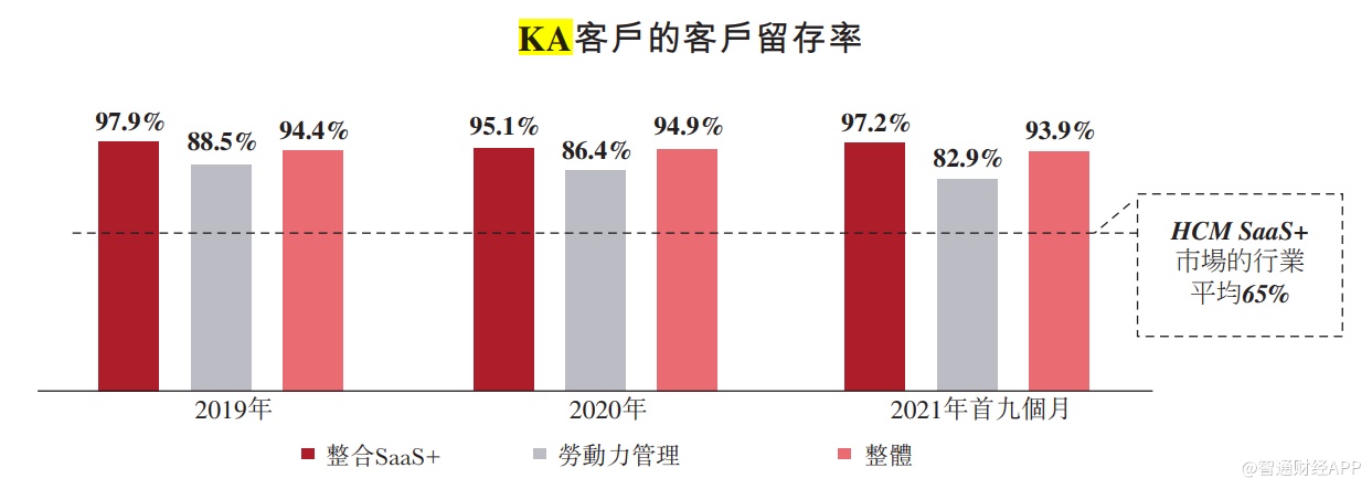 从客户留存率上看,CDP集团的整合SaaS+业务表现良好。据灼识咨询数据显示,2019、2020、2021年前三季度,整合SaaS+业务优质客户留存率分别为97.9%、95.1%及97.2%,均超同期行业的平均水平;且该业务同期的优质客户客户收入留存率分别为107%、119.1%及119.6%,持续维持在较高水平。同时,同期的劳动力管理的优质客户留存率分别为88.5%、86.4%、82.9%,亦在行业平均水平之上。