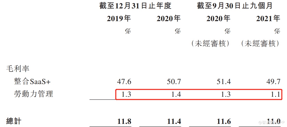从毛利率上看,对CDP集团的亏损便已不在意外。智通财经APP发现,虽然CDP集团2019至2021年前三季度的毛利率分别11.8%、11.4%、11%,但若拆分来看,同期劳动力管理业务的毛利率分别为1.3%、1.4%、1.1%。如此之低的毛利率,大幅拉低了公司整体的毛利率水平,且由于劳动力管理业务的收入占比高达仅80%,因此低毛利的劳动管理业务是CDP集团亏损的主要原因。