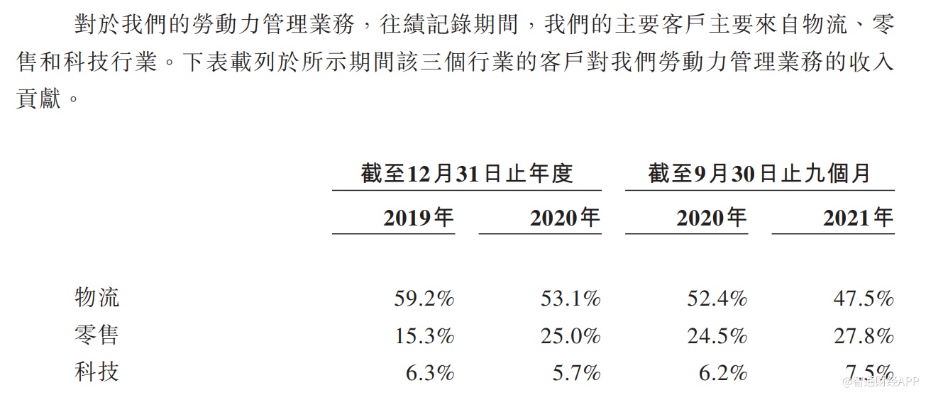 之所以有如此大的差距,或许有以下两个方面的因素,其一是公司的劳动管理业务主要在物流、零售领域的价值含量相对较低的工位上,而缺乏对科技、医药等领域高价值含量工位的覆盖,2019至2021年前三个季度,劳动力管理业务来自物流、零售领域的收入占比分别为74.5%、78.1%、75.3%,而科技领域的占比仅有6.3%、5.7%、7.5%。