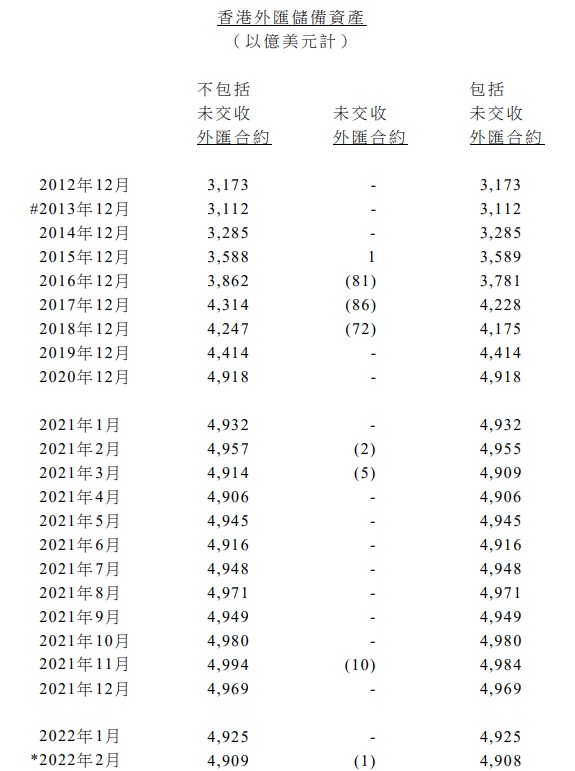 连同未交收外汇合约在内,香港于2022年2月底的外汇储备资产为4,908亿美元(2022年1月底为4,925亿美元)。为数4,909亿美元的外汇储备资产总额,相当于香港流通货币6倍多,或港元货币供应M3约47%。