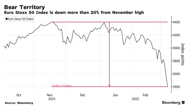欧洲斯托克50指数已从去年11月的高点下跌逾20%