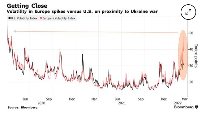 由于俄乌战争更靠近欧洲,欧股市场的波动较美股剧烈