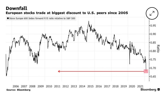 欧洲股票相对于美股的折价幅度是2005年以来最大的