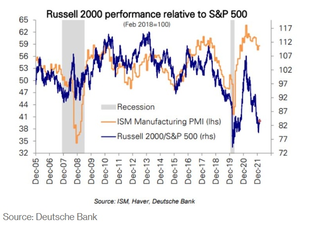 Chadha将股市指标的趋势线速度与ISM制造业报告进行对比,发现标普500指数目前的水平预示制造业指标将大幅降至48,低于与经济增长相符的水平。小盘股则反映了更深层次的问题,该策略师表示,已经进入熊市的罗素2000指数似乎预示着制造业指数将降至40,这一水平表明美国经济将陷入“严重衰退”。