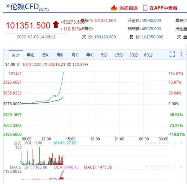 智通财经APP获悉,继昨日收盘暴涨67%之后,LME(伦敦金属交易所)期镍日内涨幅继续扩大。截至北京时间14:09,伦镍日内涨幅超110%并突破10万美元关口,报101350美元/吨,再度刷新历史新高。
