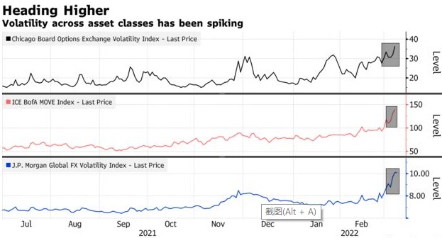 智通财经APP了解到,在本已对美联储收紧政策高度担忧的市场,俄乌冲突导致几乎所有资产都遭遇了惊心动魄的波动。Sundial Capital Research的数据显示,股市、债券、大宗商品、黄金和石油的波动性均为一年来最高,这是一场少见的协同现象。