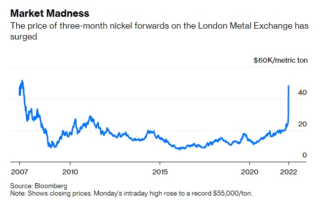 在任何市场上,一份合约在一天之内价值翻倍的情况并不常见,但周一,在伦敦金属交易所镍上演了这种行情,该金属的期货价格一天内飙升90%,曾一度高达每吨5.5万美元,最后收于48078美元。