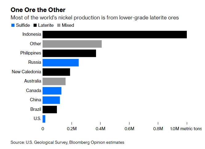 世界上大部分的镍产自于低级别的红土镍矿