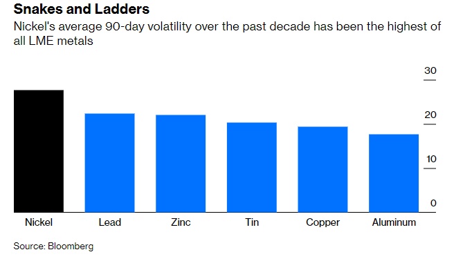 过去10年,镍的90天平均波动率是LME所有金属中最高的