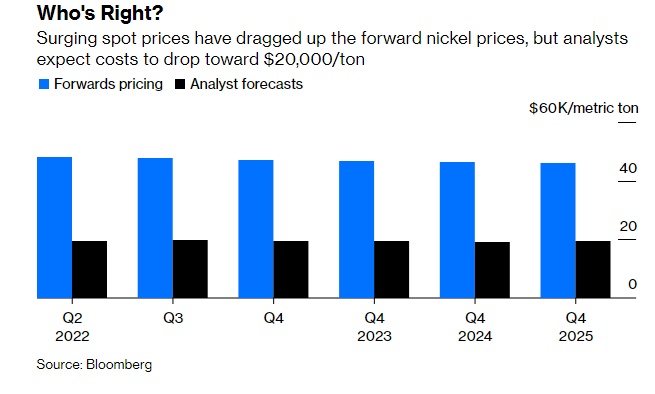 现货价格大涨拉高远期镍价,但分析师预计最终将降至每吨2万美元