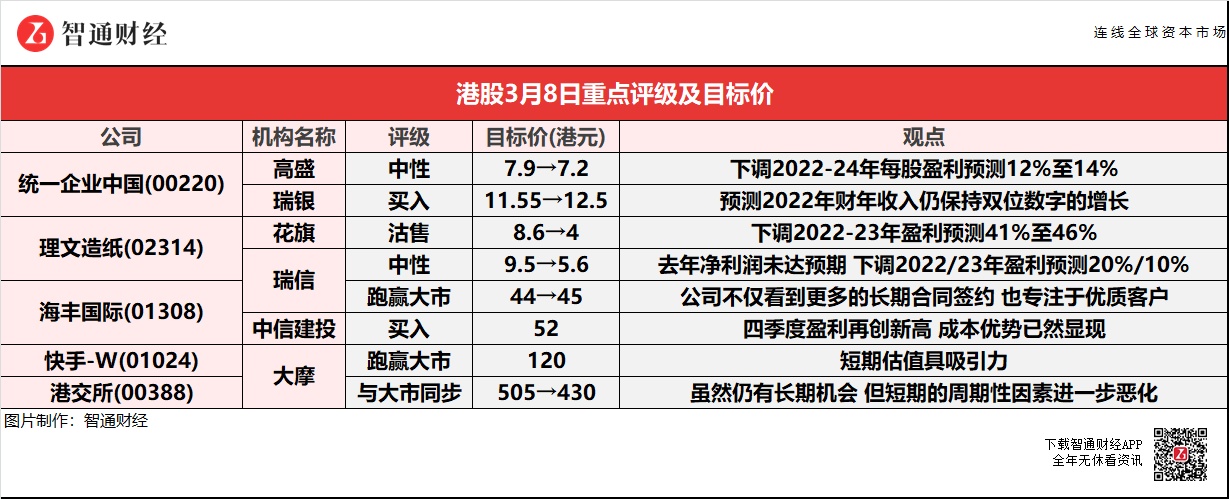 瑞信将理文造纸(02314)评级由“跑赢大市”下调至“中性”,目标价由9.5港元下调41%至5.6港元。并下调2022/23年盈利预测20%/10%,至33亿元/37亿元,以反映销量和毛利率预测下调;同时引入2024年的盈利预测为40亿元。报告中称,理文造纸去年净利润同比跌11%至33亿元,未达该行及市场预期。该行提到,春节过后需求恢复比预期慢,预计纸厂相对较高的库存将继续对纸价造成压力。随着市场接近淡季,预计可能扩大的市场过剩情况将对包装纸价格带来下行压力。