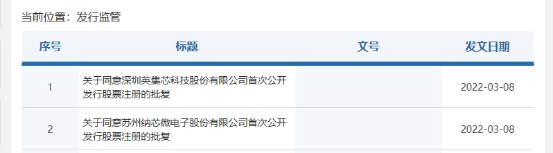 智通财经APP获悉,据证监会3月8日消息,证监会按法定程序同意深圳英集芯科技股份有限公司、苏州纳芯微电子股份有限公司科创板首次公开发行股票注册。