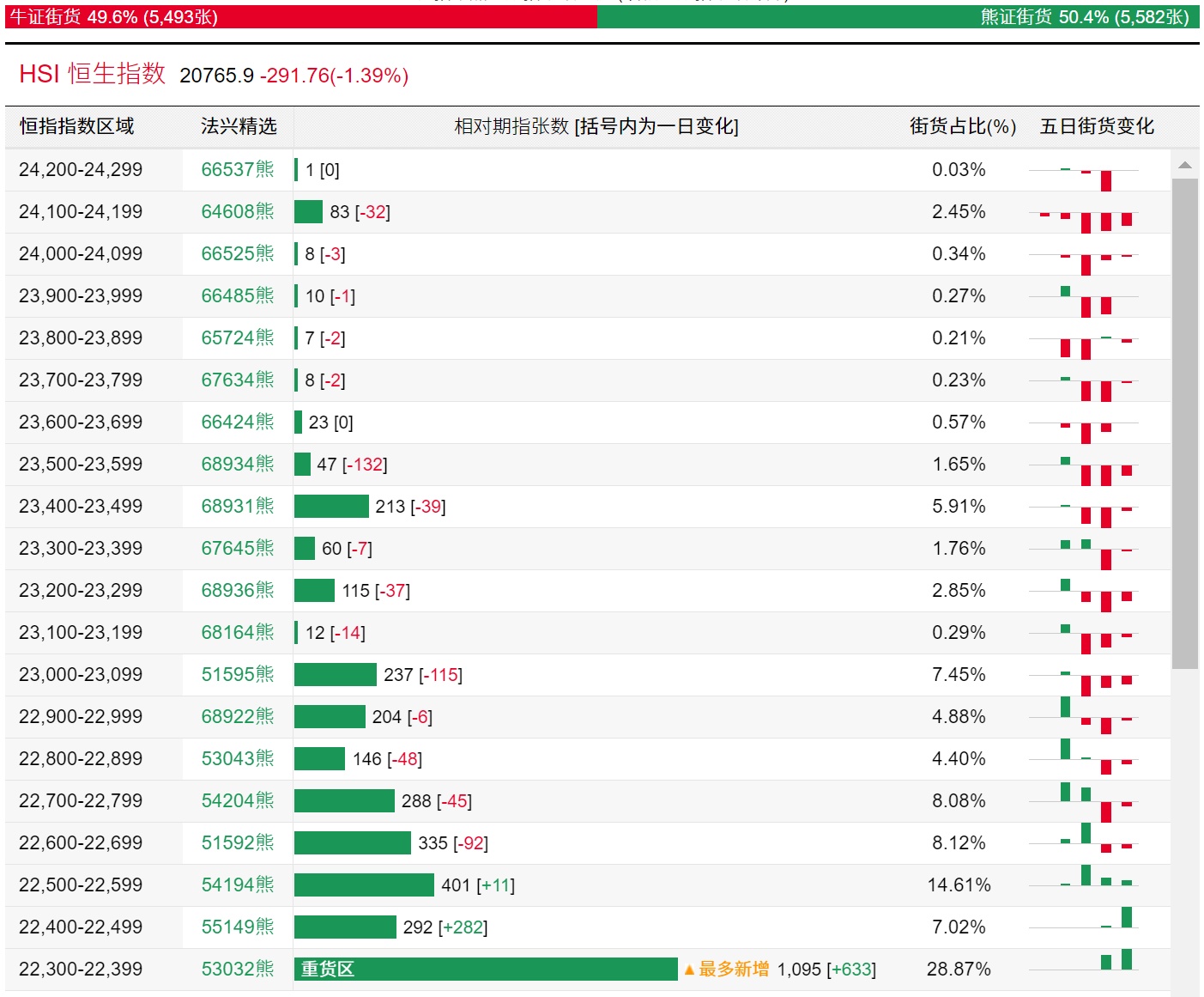法兴恒指牛熊证街货分布图中的数据显示,熊证街货重货区和最多新增都在22300-22399区间,该区间最新熊证数量为1095张,较上一交易日增加633张。
