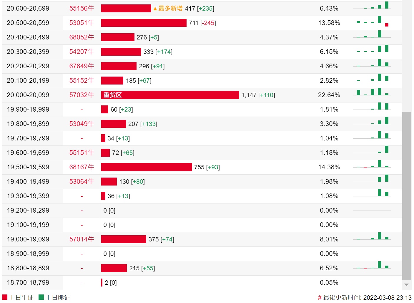 牛证街货重货区在20000-20099区间,该区间最新牛证数量为1147张,较上一交易日增加110张;最多新增在20600-20699区间,该区间最新牛证数量为417张,较上一交易日增加235张。