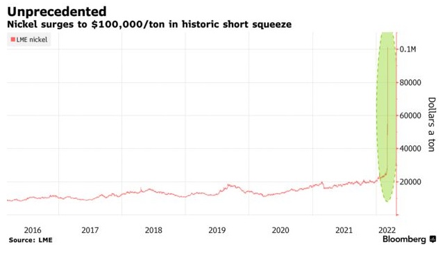 在俄乌冲突的推动下,镍价出现了前所未有的飙升,将一度低迷的矿山投资组合变成了宝贵的资产。伦敦期镍在3月8日一度涨超100%,镍价在过去两天飙升了250%,创下每吨10万美元以上的历史新高。