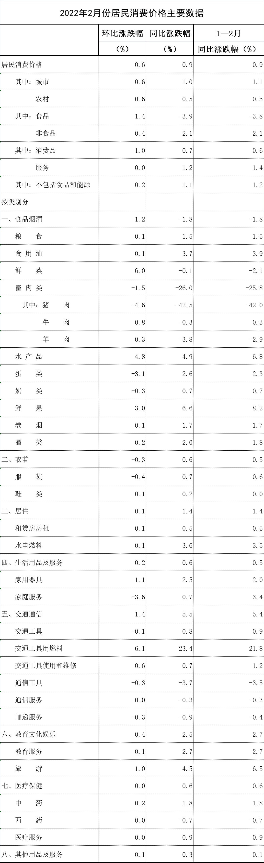 2022年2月份居民消费价格同比上涨0.9% 环比上涨0.6%