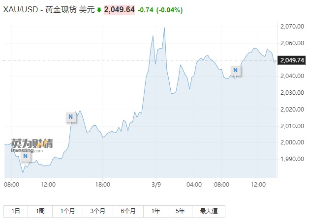 截止发稿,黄金现货日内跌0.04%,报2049.64美元。黄金价格周二更是触及 2070.44 美元,仅比 2020 年 8 月创下的历史最高点低 5 美元。