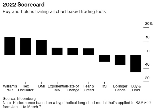 2022年开年至今,在美联储加息预期以及俄乌冲突引发大宗商品价格飙升的影响下,股市投资者的耐心无疑受到了极大的考验,这也令技术分析在今年的美股市场上展现出优势:数据显示,今年选择买入并持有股票策略的收益比在Bloomberg技术分析库中的每一种基于图表的交易模式都要糟糕。