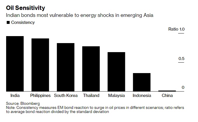 在亚洲新兴债券市场中,印度债市似乎是最容易受到油价冲击的市场之一。根据Bloomberg对可追溯至2015年的7个相似事件的分析,在近年来原油价格大幅度上涨期间,印度国债收益率平均上涨10个基点。尽管政策制定者保证在本月底之前不会再进行债券拍卖,但国债收益率在大约两周内跃升超20个基点。