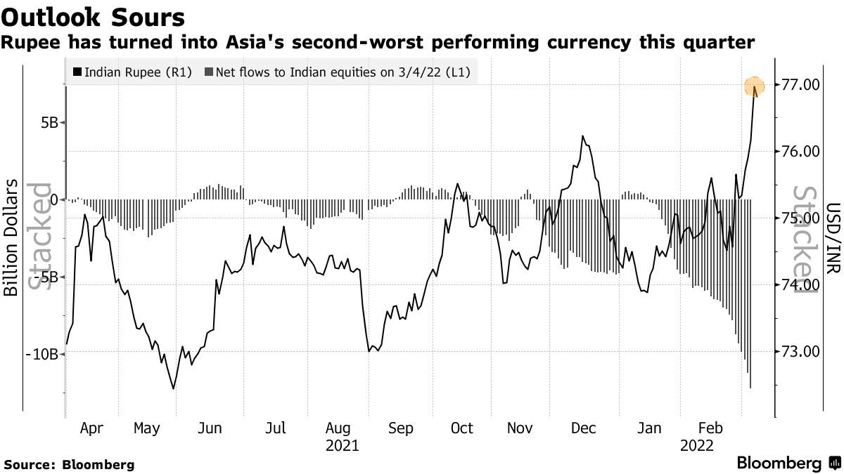 TCG Advisory Services首席投资官Chakri Lokapriya表示:“卢比目前处于创纪录低点,海外投资者将继续抛售印度股票和债券,直到俄乌冲突出现实质性缓解迹象,以及大宗商品价格开始企稳。”