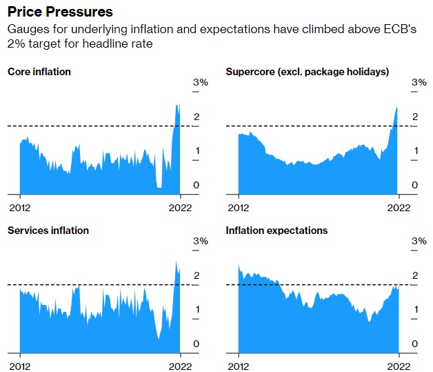 欧洲央行的决策在一定程度上取决于潜在通胀趋势,即政策制定者通过剔除食品和能源等波动较大的几个指标来跟踪价格趋势。但供应链混乱和油气成本飙升的连锁反应可能会将这些指标推得过高,扭曲了其本应阐明的情况。