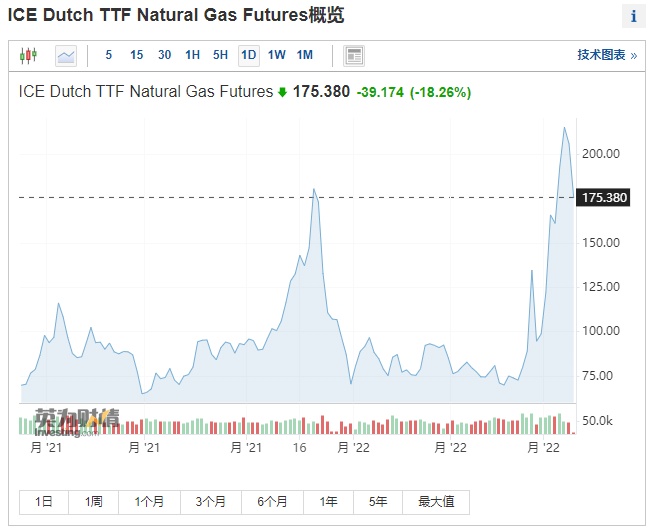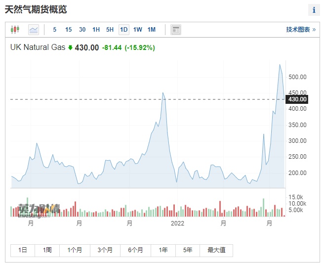 截至发稿,英国4月天然气期货价格跌15.92%,报430.00便士/撒姆;荷兰TTF基准天然气期货价格跌18.26%,报175.38欧元/兆瓦时。