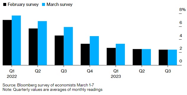 在3月1日至7日对经济学家的月度调查显示,受访者预计2022年第一季度CPI同比平均增幅为7.7%,高于2月份调查时的7%;他们预计今年最后三个月CPI将上涨4.5%,比上个月的预测高出一个多百分点。